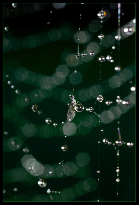 Still, aphids are a vital part of the garden food chain, like the wildebeests or antelopes of the African plains. I call the shot above “The Bubble Trap”. A blackfly is caught in a double trap of web and water droplet.