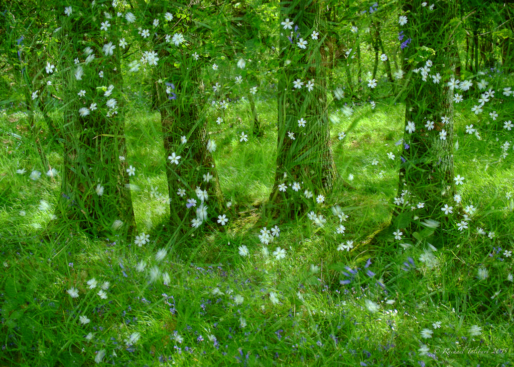 Equally in vogue, making multiple-exposures in-camera can have unexpected and pleasing results. Many modern digital cameras make this simple. I used my Fuji X-E1 for the shot below. The image on which you are going to superimpose a second shot is shown in live view under the picture you are now taking, enabling you to visualise exactly what you are going to achieve. This image features stitchwort, tiny white flowers I found growing among the bluebells at a local copse on Tuesday.
